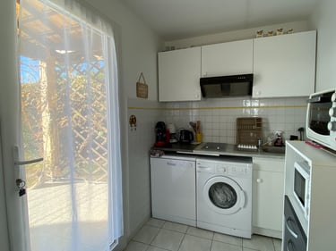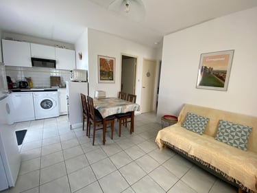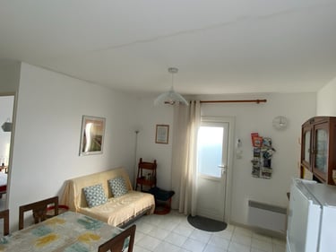 Pièce à vivre lumineuse: avec coin cuisine entièrement équipé : salon confortable, TV avec box, espace repas convivial.